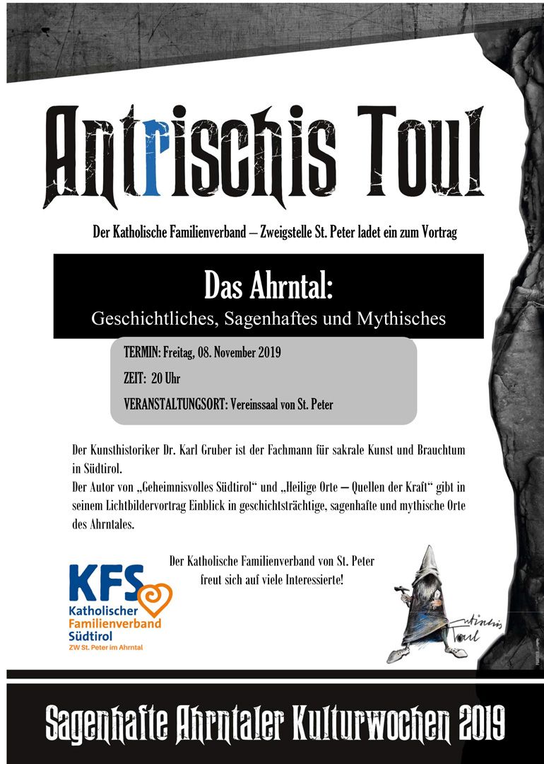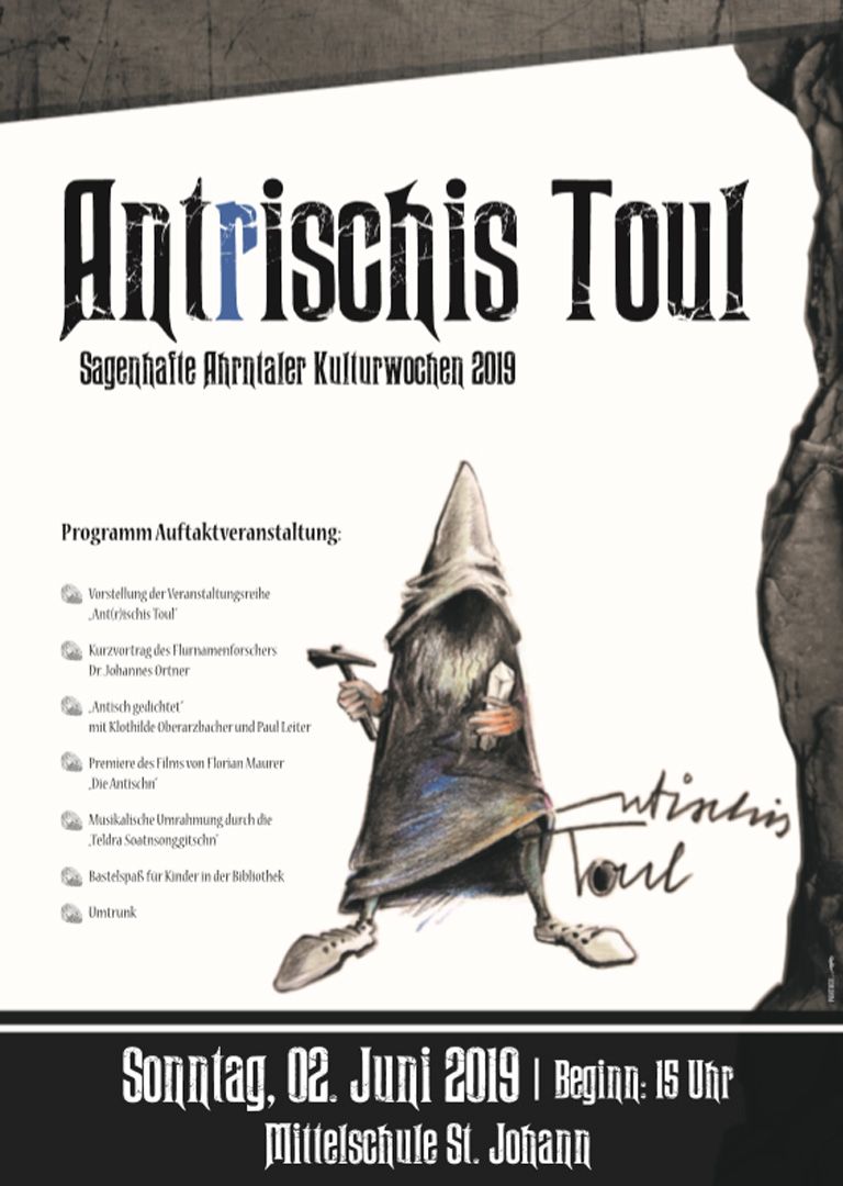 Auf Anregung von Paul Gruber vom Geschichtsverein Ahrntal hat Kathrin Gschleier vom Zentrum Narrativ das Konzept „Antrisches Ahrntal" erarbeitet. Ideal für das Gesamtprojekt ist eine gemeinsame Präsentation der Veranstaltungsreihe an der Auftaktveranstaltung und die Einbindung der einzelnen Ortschaften Luttach, Weißenbach, St. Johann, Steinhaus, St. Jakob und St. Peter und Prettau im Zuge des Programms. Vorgestellt werden das gesamte Kulturprogramm und die wichtigsten Veranstaltungen gemeinsam Anfang Juli 2019 unter dem gemeinsamen Logo „Antrischis Toul“.
