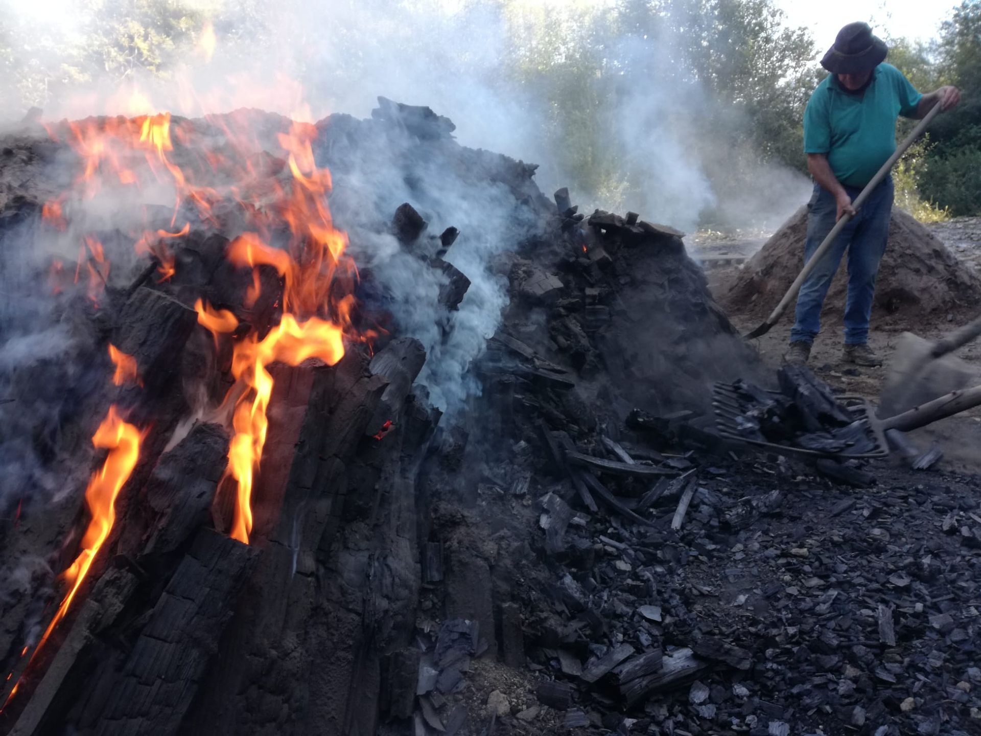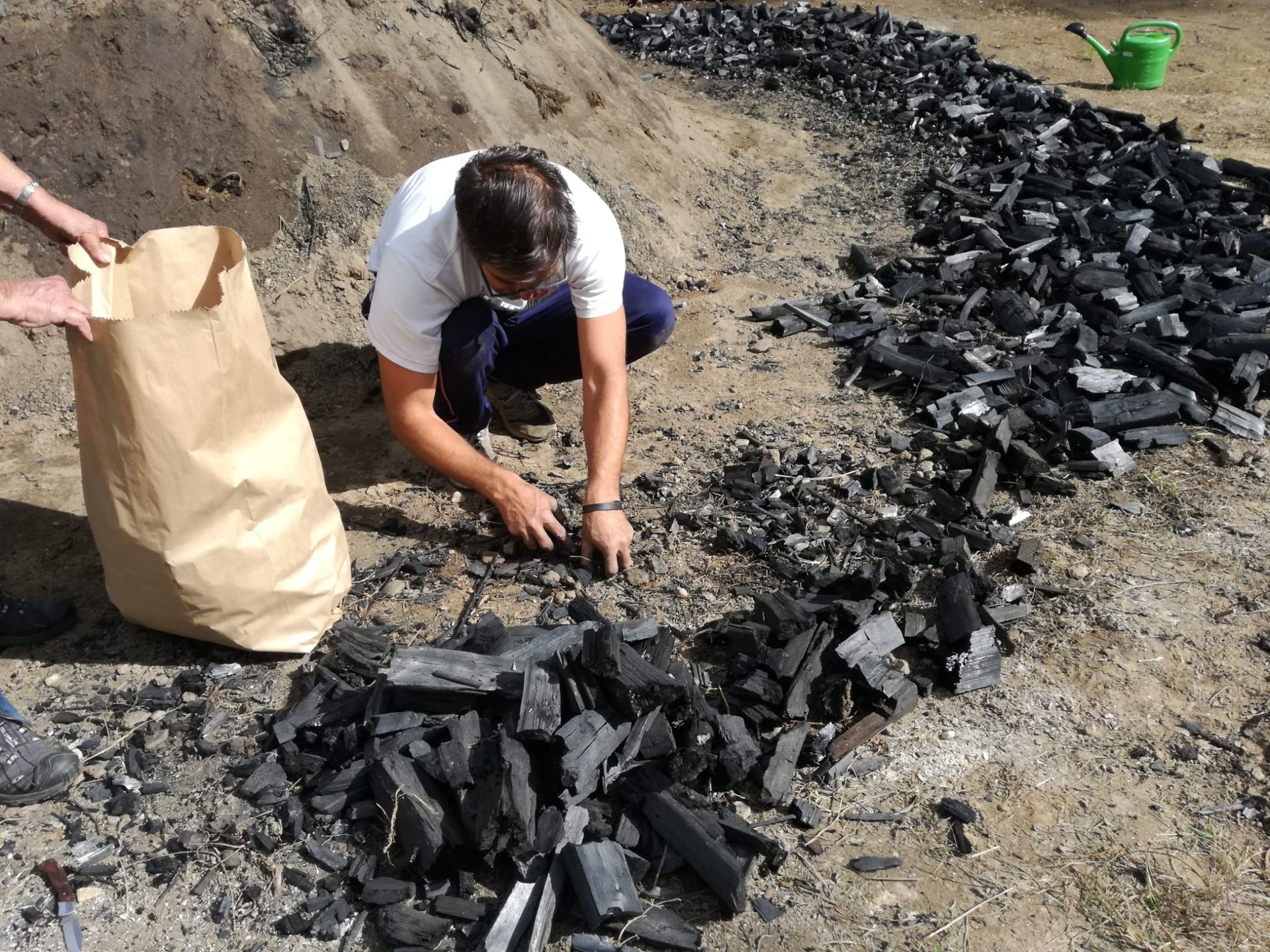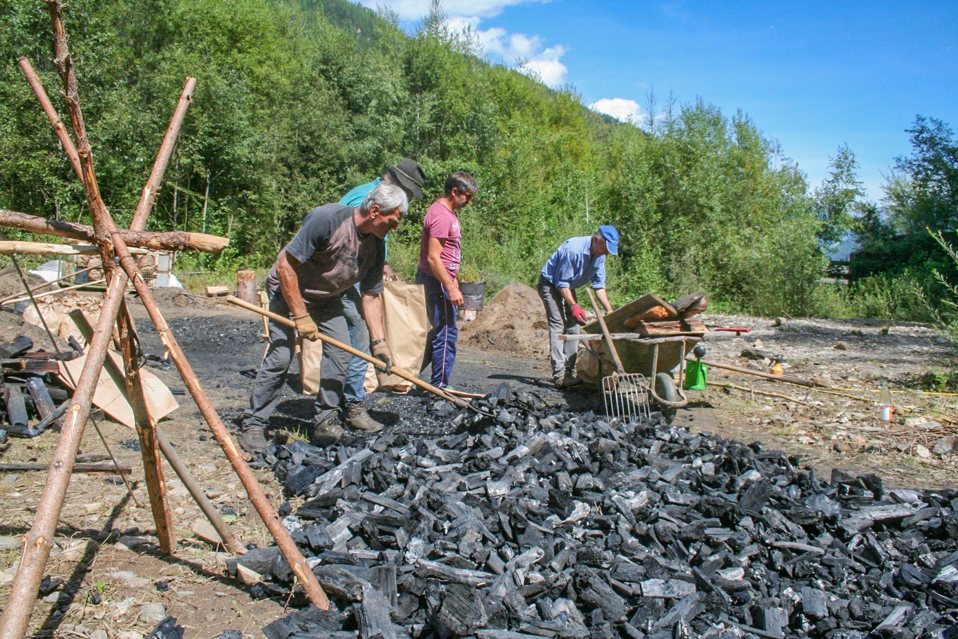 Ludwig lacht: „Verlust ist erst, wenn wir Asche haben.“ Nach 8 Tagen gab der Köhler grünes Licht, den Meiler zu öffnen und den ersten Teil der Kohle zu entnehmen. In der Köhlersprache wird dies „ausziehen“ genannt. Dabei wird die Hülle aus Erde und Tax entfernt, die etwa 550 Grad heiße Kohle mit reichlich Wasser „gelöscht“ und mit Rechen streifenförmig neben dem Meiler verteilt, damit vorhandene Glutnester rasch entdeckt und gelöscht werden können, immer gemäß dem Grundsatz: „So viel Wasser wie nötig, aber so wenig wie möglich“, denn das Wasser verschlechtert die Qualität der Kohle. Nachdem sichergestellt war, dass die letzten Glutnester erloschen waren, konnte mit dem Absacken der Kohle begonnen werden. Dank der guten Organisation und der vielen anpackenden Hände ging diese stinkende und staubige Arbeit gut voran und bald war die Kohle in Papiersäcken verpackt und zum Abtransport gestapelt. Während die Kohle viele Jahrhunderte lang einen wichtigen Nebenerwerb für die bäuerliche Bevölkerung des Ahrntales bedeutete und in den Schmelzöfen des Ahrner Handels war, wird der Jahrgang 2020 in den meisten Fällen heimische Grillstellen befeuern. Ein Teil der Kohle wird die bisher verwendete Steinkohle beim Schmieden ersetzen