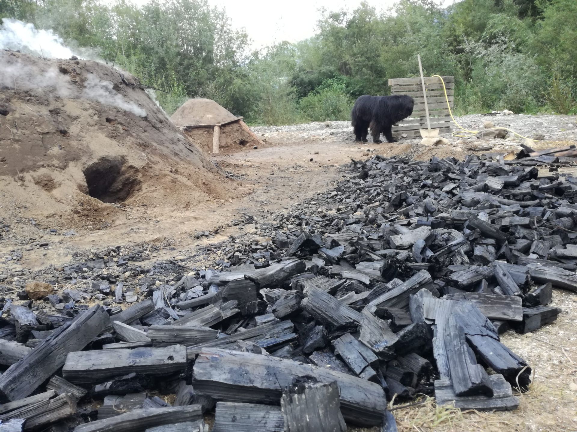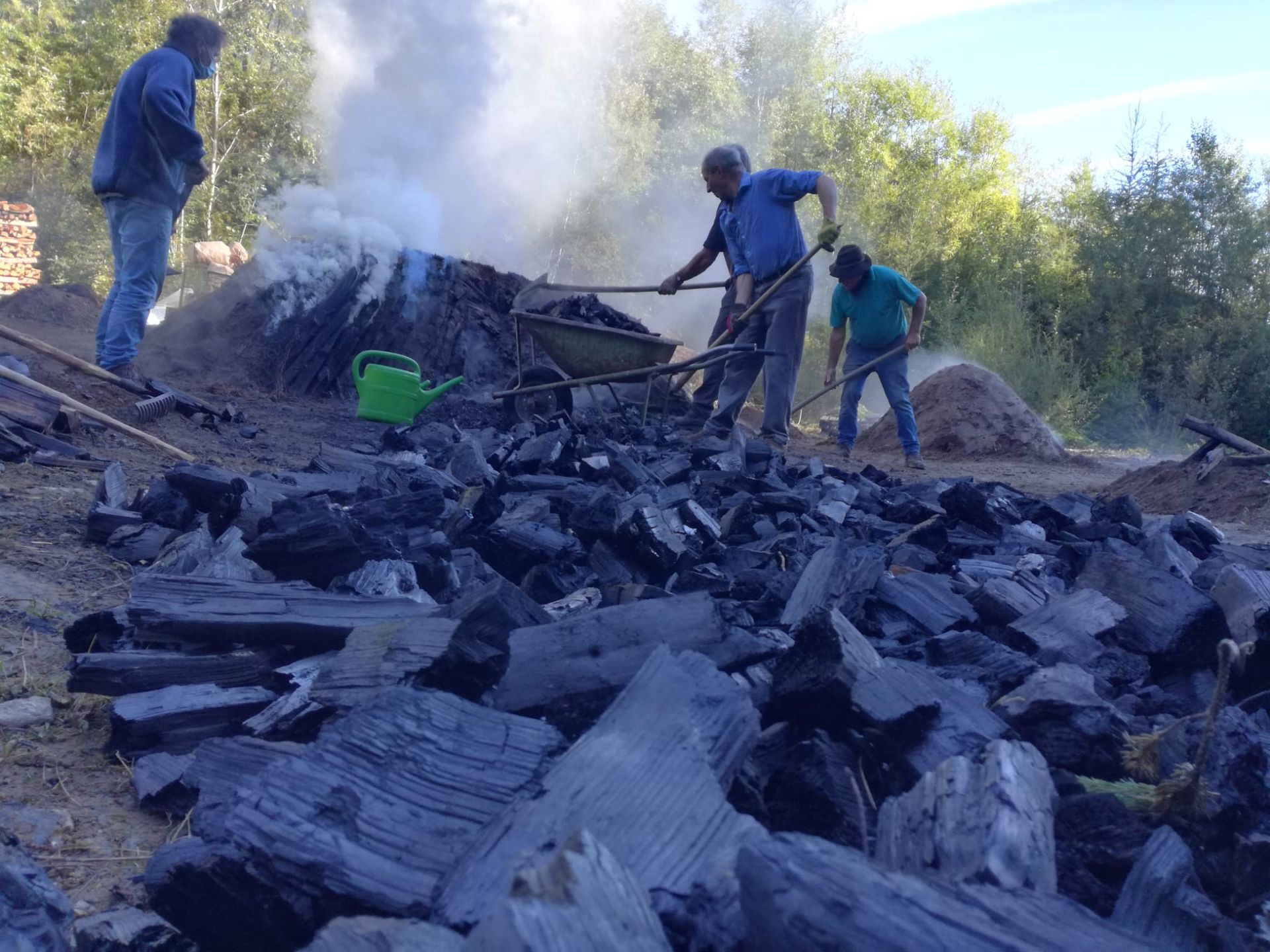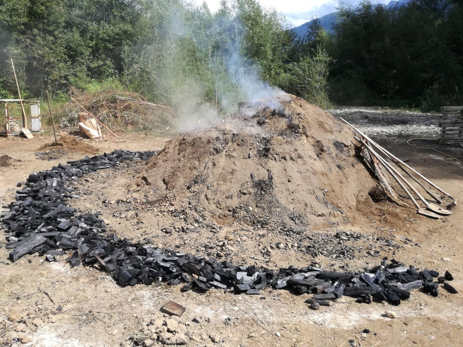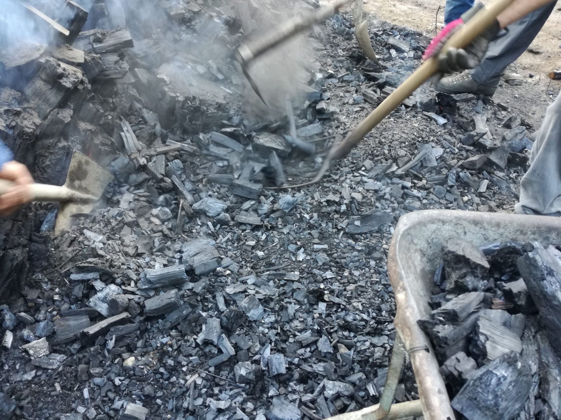 Ludwig lacht: „Verlust ist erst, wenn wir Asche haben.“ Nach 8 Tagen gab der Köhler grünes Licht, den Meiler zu öffnen und den ersten Teil der Kohle zu entnehmen. In der Köhlersprache wird dies „ausziehen“ genannt. Dabei wird die Hülle aus Erde und Tax entfernt, die etwa 550 Grad heiße Kohle mit reichlich Wasser „gelöscht“ und mit Rechen streifenförmig neben dem Meiler verteilt, damit vorhandene Glutnester rasch entdeckt und gelöscht werden können, immer gemäß dem Grundsatz: „So viel Wasser wie nötig, aber so wenig wie möglich“, denn das Wasser verschlechtert die Qualität der Kohle. Nachdem sichergestellt war, dass die letzten Glutnester erloschen waren, konnte mit dem Absacken der Kohle begonnen werden. Dank der guten Organisation und der vielen anpackenden Hände ging diese stinkende und staubige Arbeit gut voran und bald war die Kohle in Papiersäcken verpackt und zum Abtransport gestapelt. Während die Kohle viele Jahrhunderte lang einen wichtigen Nebenerwerb für die bäuerliche Bevölkerung des Ahrntales bedeutete und in den Schmelzöfen des Ahrner Handels war, wird der Jahrgang 2020 in den meisten Fällen heimische Grillstellen befeuern. Ein Teil der Kohle wird die bisher verwendete Steinkohle beim Schmieden ersetzen