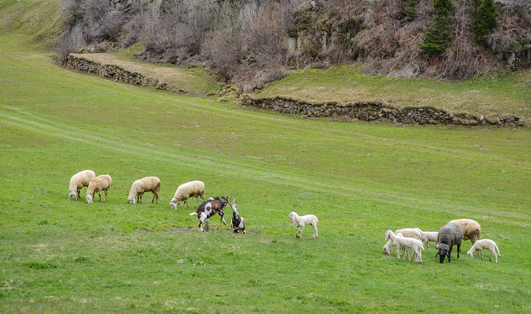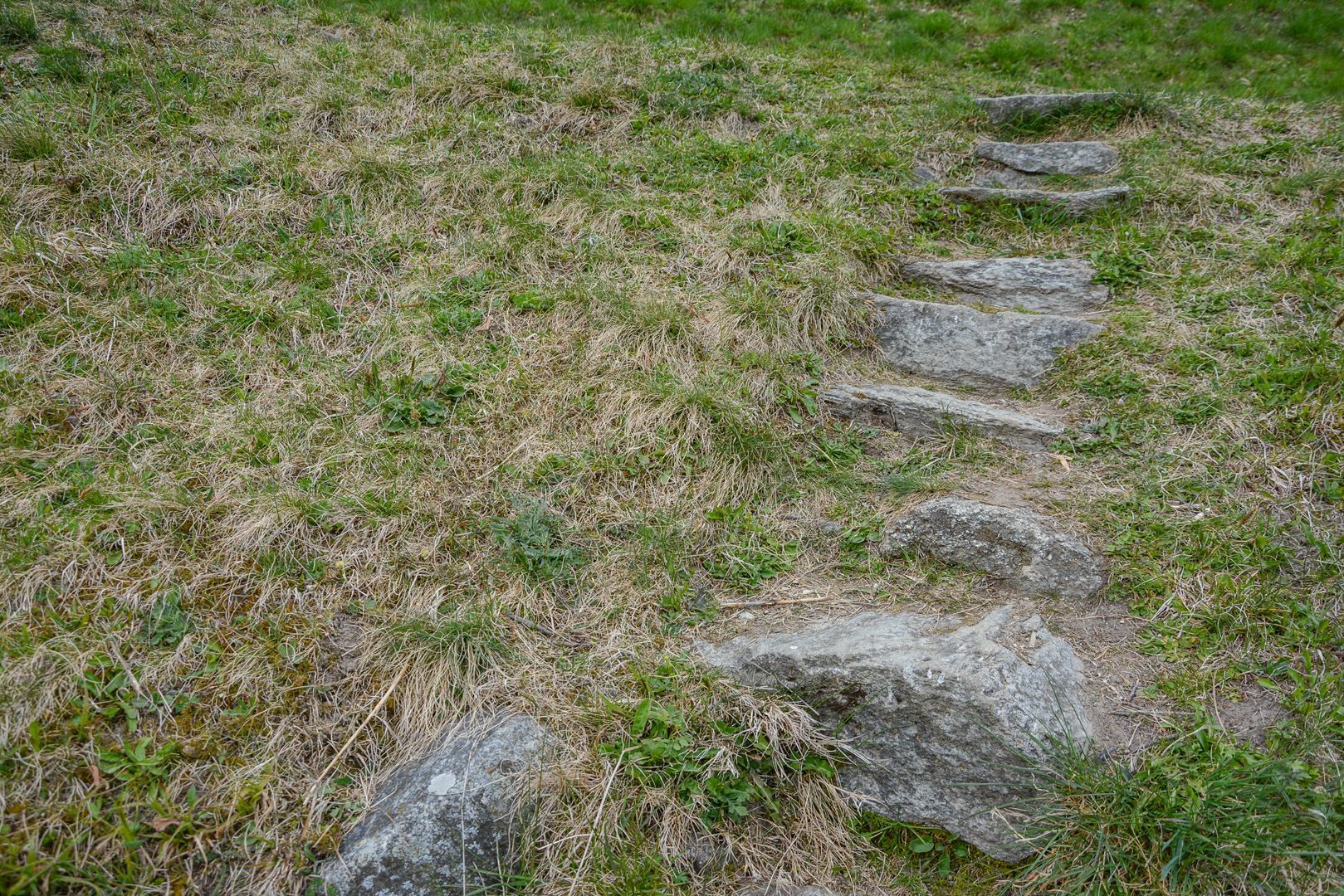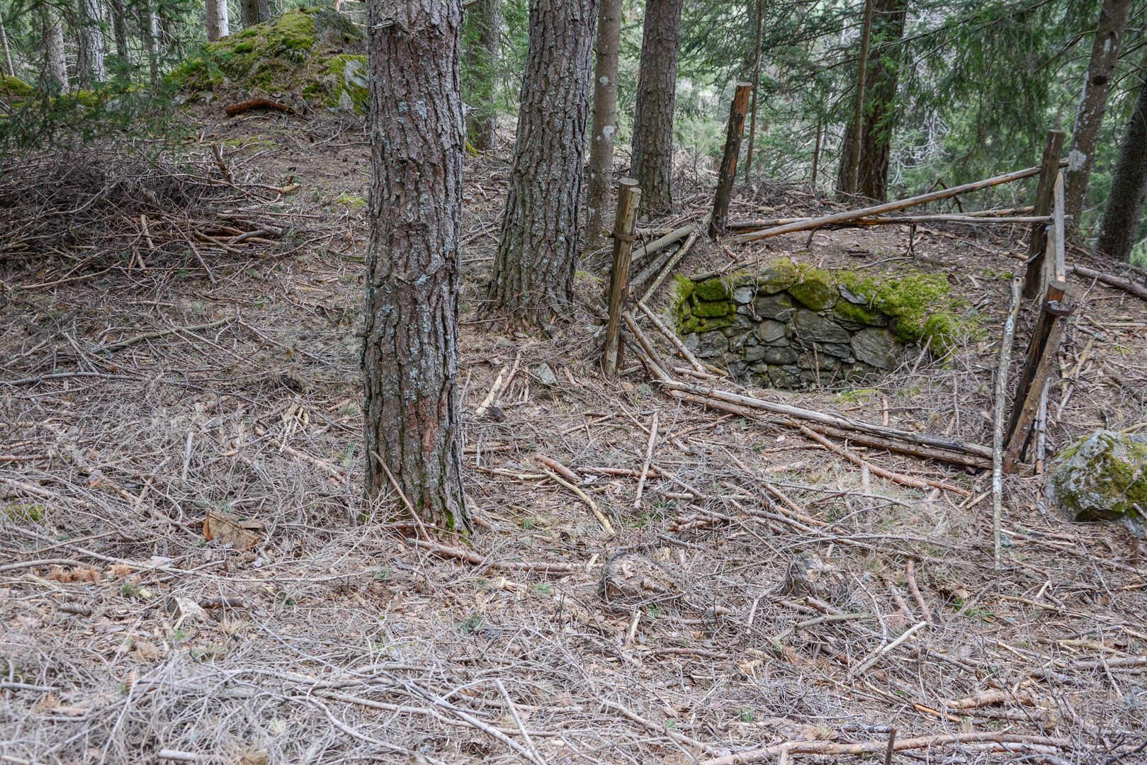 Nach Besichtigung der Hofkapelle treten wir den Aufstiegsweg an, der im Wald fortgesetzt wird und zum Hof Hochlärcher 1360m führt. Ob hier schon der antrische Eingang zwischen den Steinblöcken ist lässt sich nicht sagen. Schön geschichtete Trockenmauern begrenzen den Weg hinauf zur Forststraße und durchziehen die Felder. Ursprüngliche, harte Arbeit läßt sich hier erahnen. Wir tauchen erneut in den Wald ein, vorbei an weiteren Findlingen, wo sicher schon antrische Leute hausten, gehen weiter den steileren Waldweg empor und überqueren zweimal die Schotterstraße. Die oberhalb vom Hochlärcher liegende, im Waldboden versenkte, rund ausgemauerte Fallgrube besichtigen wir beim Rückweg. Vorausgesetzt dass wir den Wolf nicht vorher begegnen.