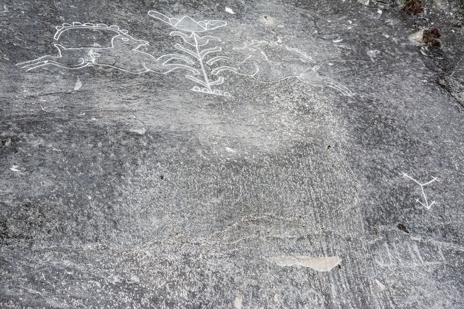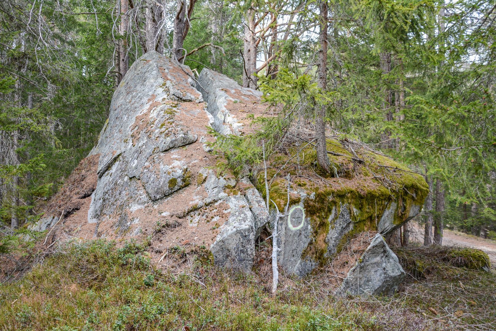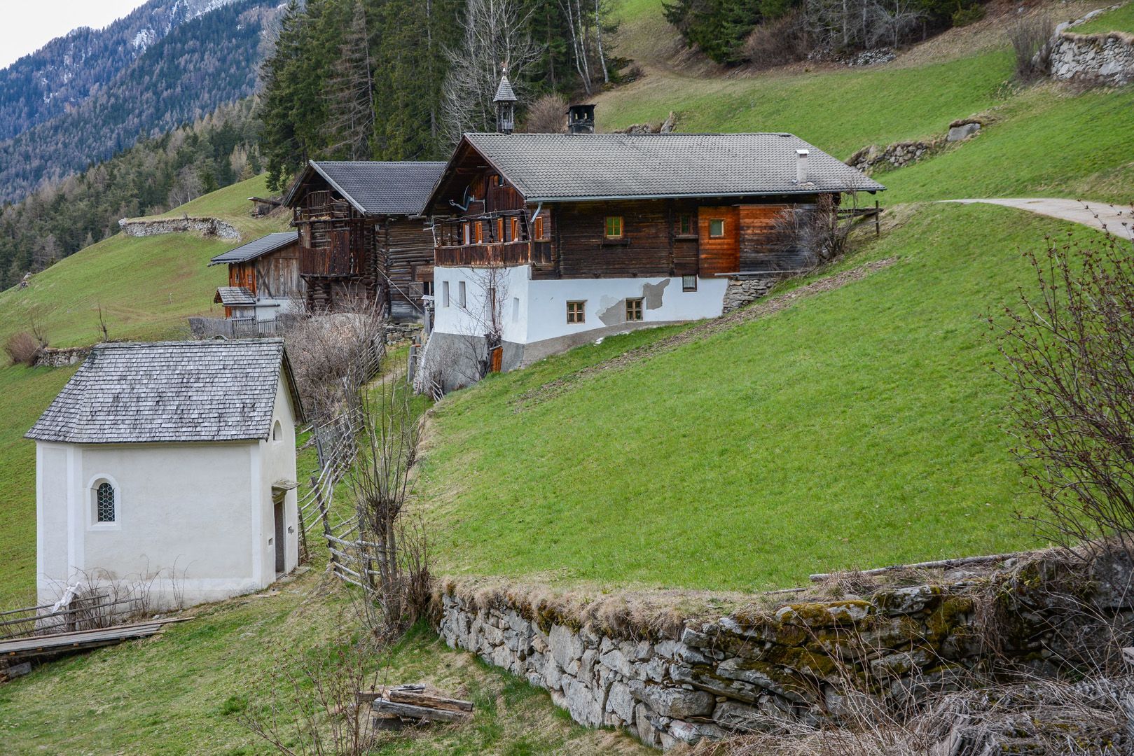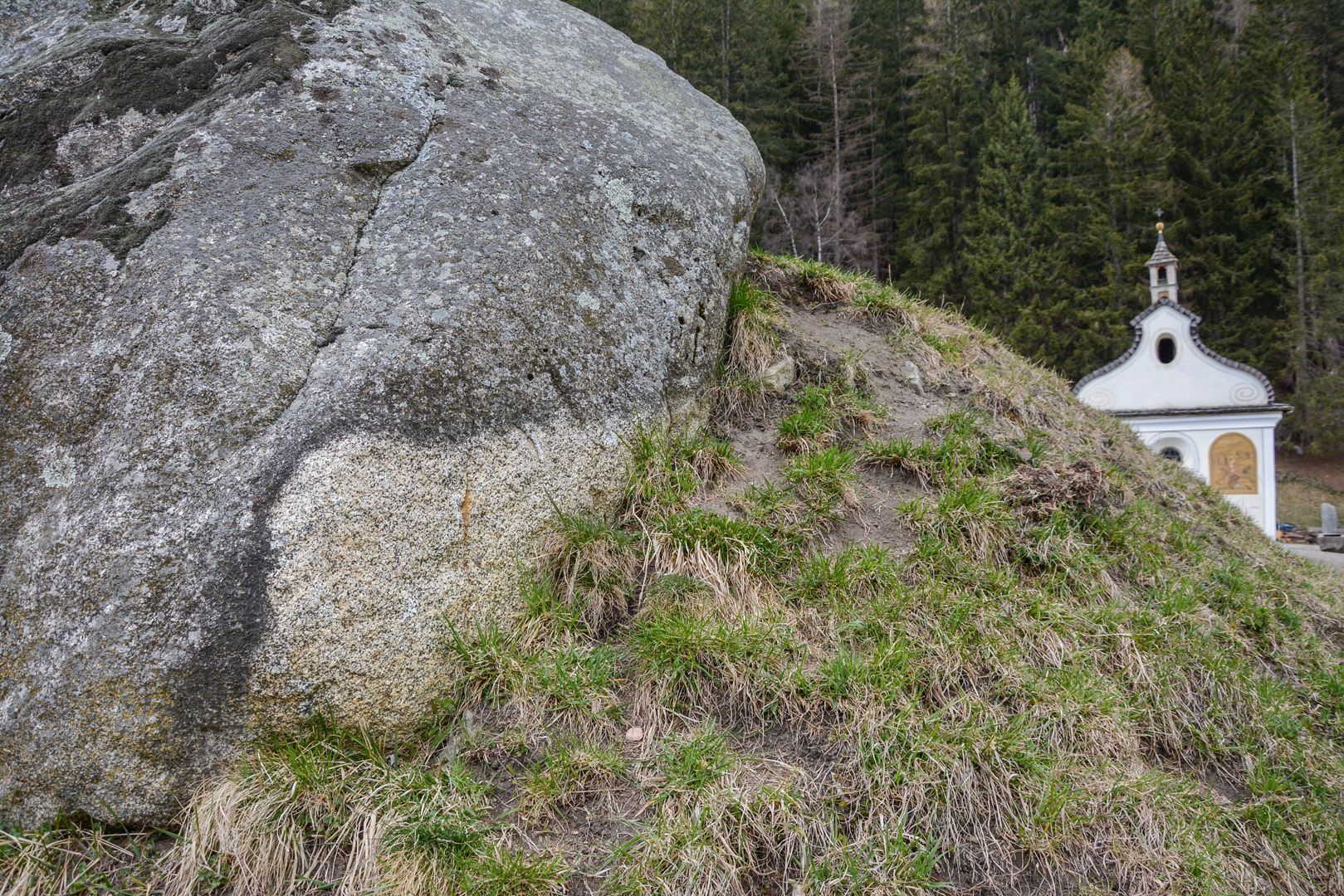 Auf der Zufahrtsstraße zum Moaregger Hof gehen wir bis zur Kehre, dann über den ausgetretenen Feldweg in den nahen Wald. Dort angekommen entdecken wir gleich unterhalb des Weges größere Granitblöcke, gebrochene Steine, Spuren der Vergangenheit, wo das Material noch händisch verarbeitet wurde. Keiltaschen und behauene Reststücke zeugen davon. Wir durchschreiten den Waldgürtel auf dem alten, teils mit Steinen stufig angelegten Feldweg, der zum Platter Hof 1.200m führt. Riesige Findlinge und schöne Trockenmauern umsäumen den Weg. Die Hofstelle vom 15. Jhdt. liegt unterhalb der marmorartigen Platterwand. Mauerreste weisen auf alte Kalkbrennöfen hin, das Gestein tritt hier durch die Gebirgsbildung neben den Zentralgneisen des Hauptkammes zutage. Eigenartige Symbole und Gravuren sind hier zu entdecken.