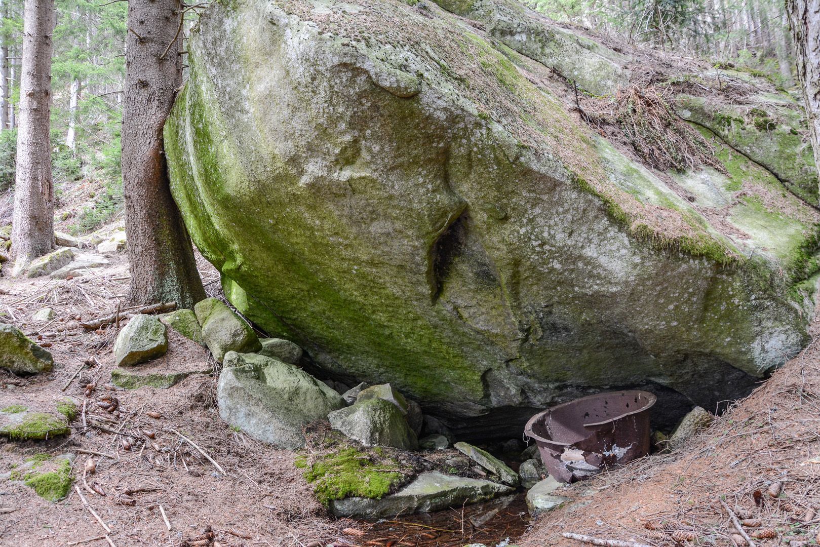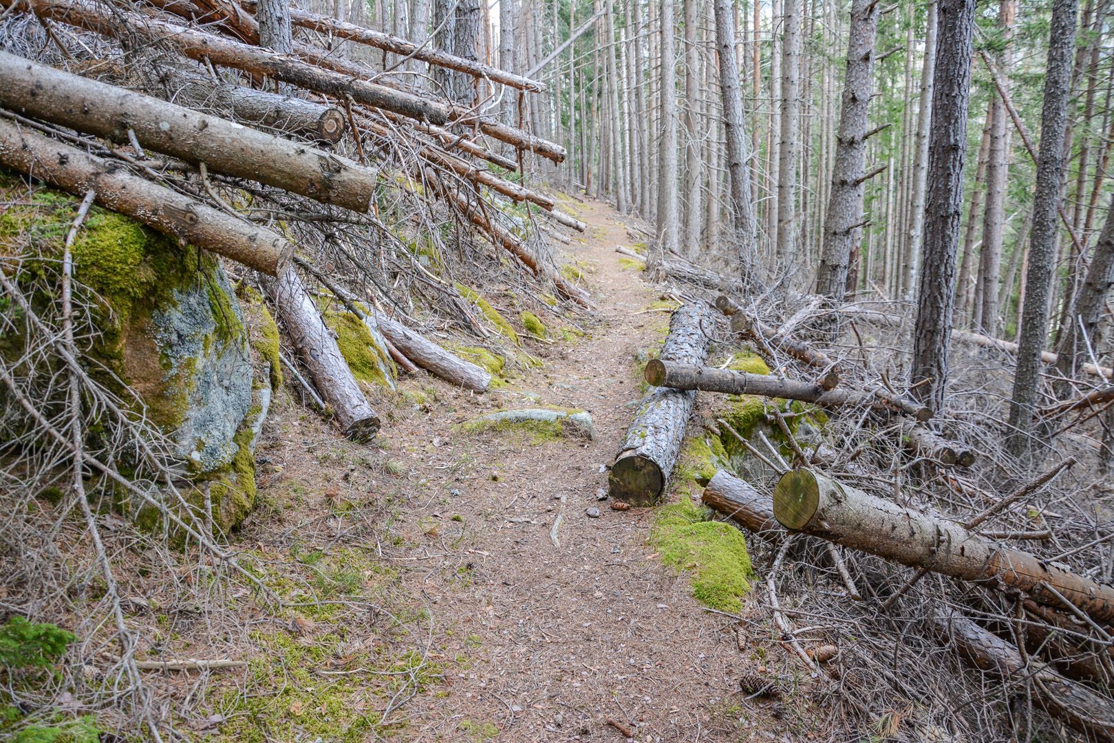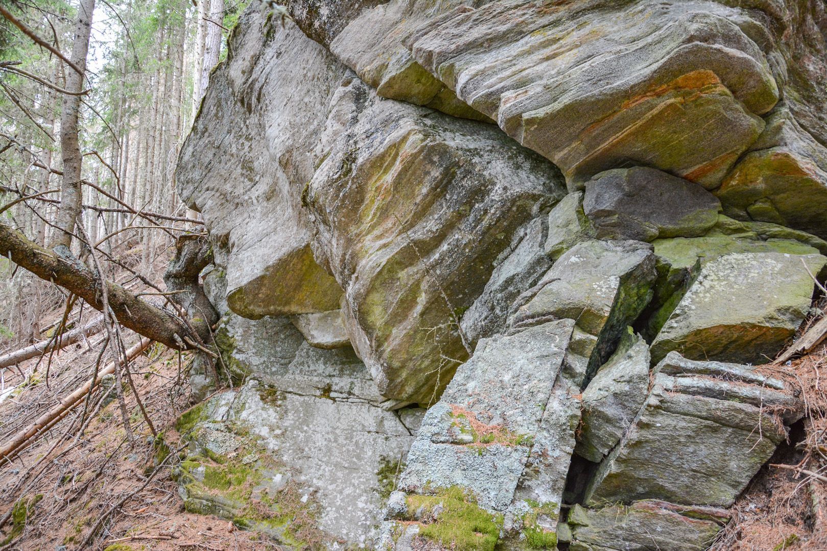 Auf Golatsch 1520m angekommen, erschließt sich der Blick durch lockeren Föhrenbestand das Frankbachtal und hintere Ahrntal. Ein mächtig, gespaltener Felsblock weist uns nun auf der Forststraße Richtung Bloßenberg zu den geheimnisvollen Löchern im steinigen Gelände. Es ist nicht leicht die Eingänge ins Innere des Berges zu finden, da vom wilden Sturmtief gefallene Bäume noch kreuz und quer die Übersicht verhindern.