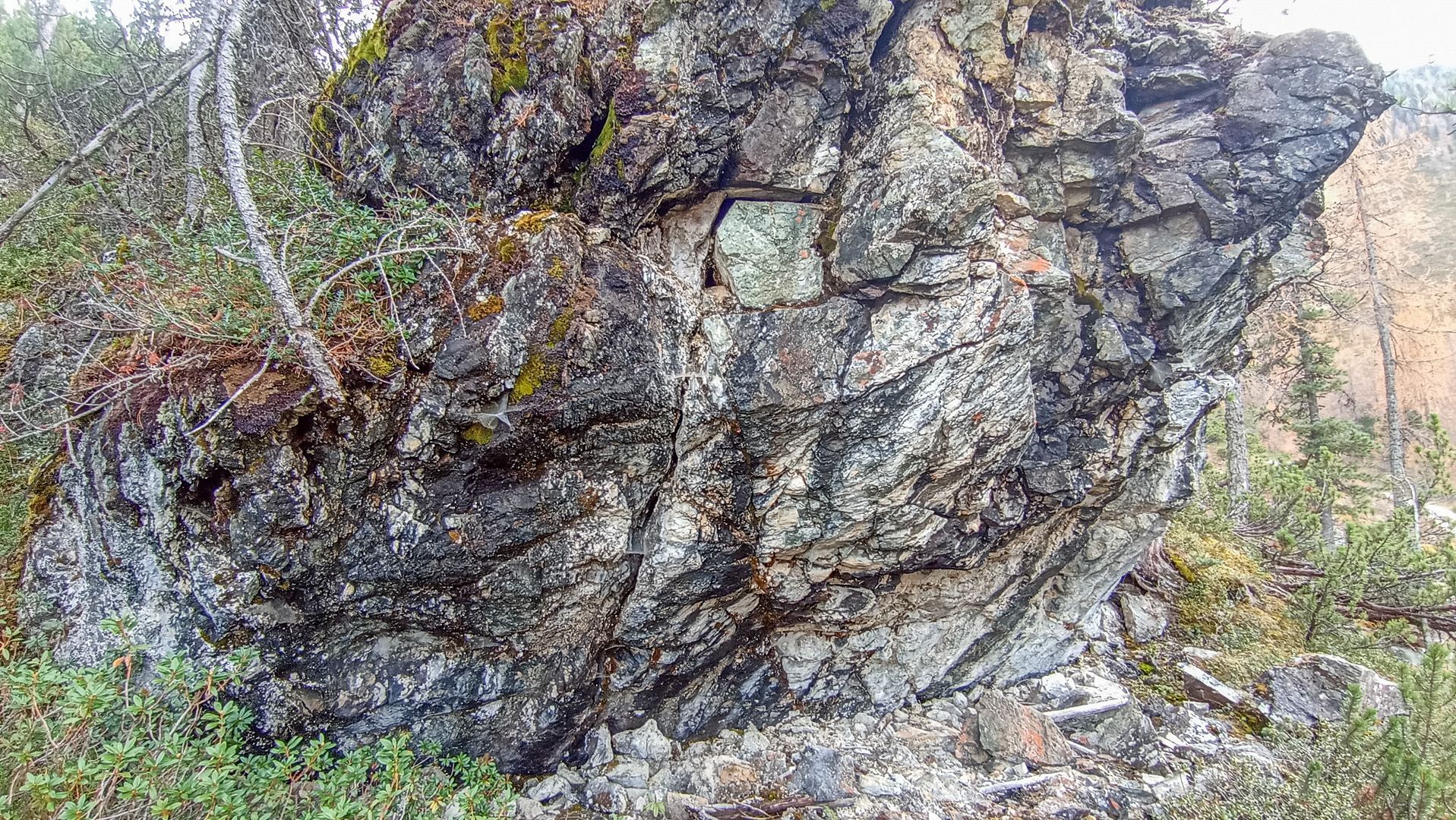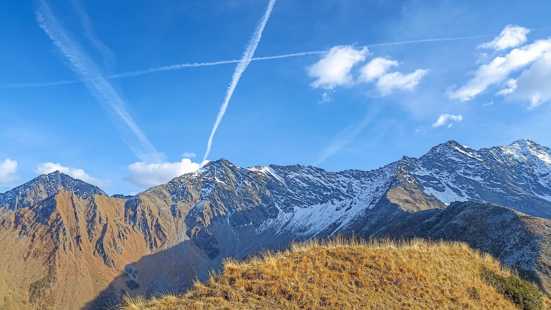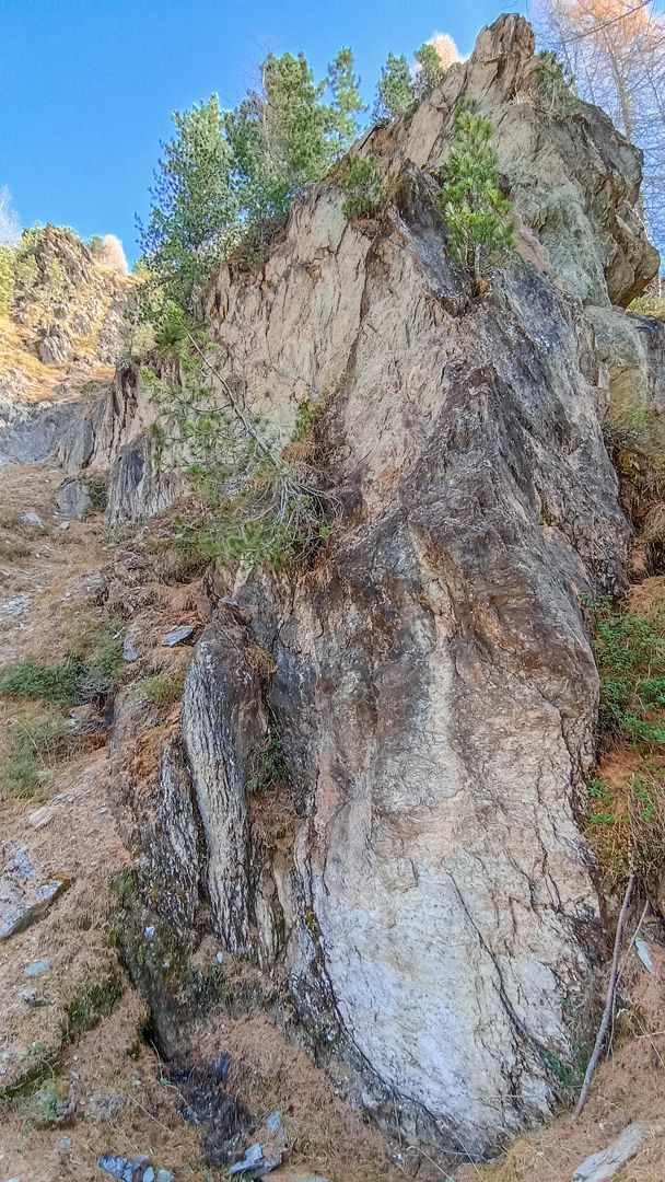 Wer sich nun zum Federweißkopf (2210m) mit den bergmännisch geöffneten Stollen begibt, muss sich durch das Weidegebiet rechtshaltend selber einen Pfad suchen. Der weiße, poröse Felsen, von schütteren Bäumen umgeben, ist nicht zu übersehen. Zum Gipfel am Hochfeld 2296m wandern wir auf dem markierten, steil ansteigenden Pfad 7a zum Grat und steigen ins Bärental ab. Bei der Seeber Hütte folgen wir den Steig Nr.13, der durch den Wald über die Pfärraböden nach Großklausen, oberhalb der Schwaiger Höfe zum Ausgangspunkt zurückführt.