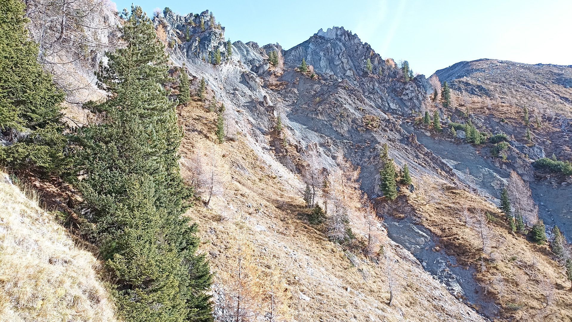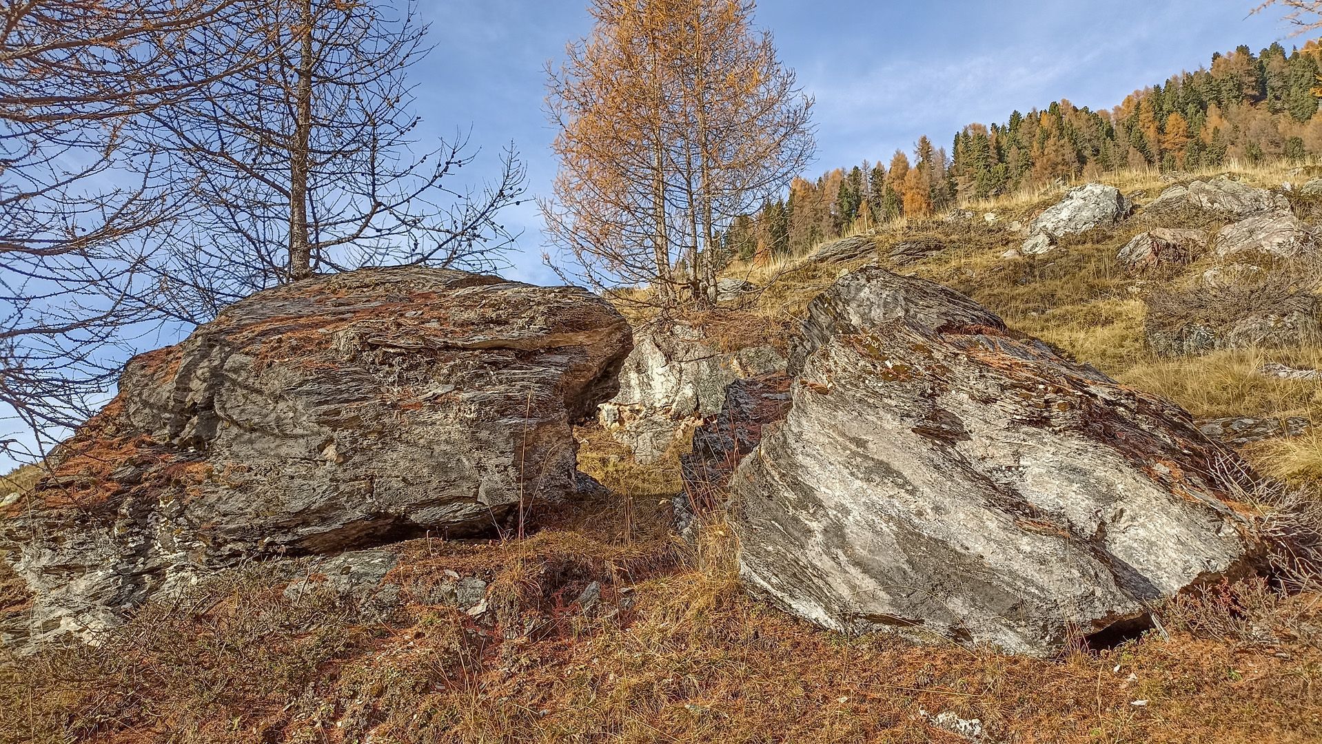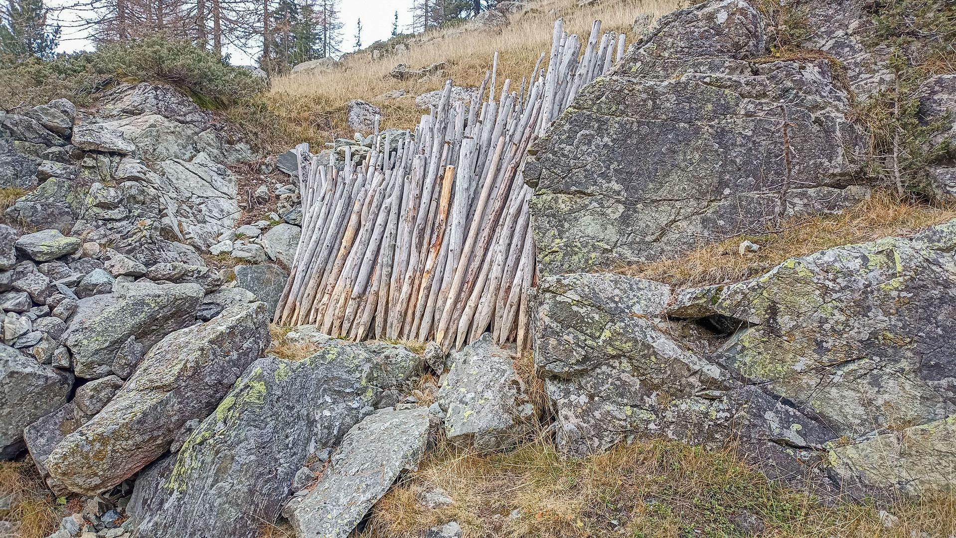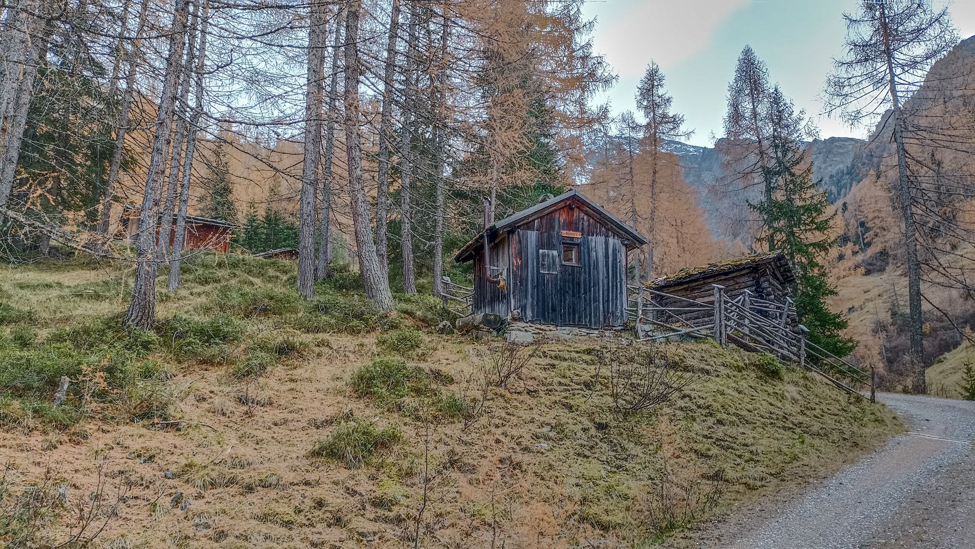 Von Steinhaus fahren wir bis zum Parkplatz oberhalb der letzten Höfe in Großklausen. Ein bequemer Forstweg Nr.2 führt an der Unterberger Alm 1648m weiter zu den Schupfen im lichten Lärchenwald und endet bei der Alm Moser Ebene 1847m. Oberhalb der Straße liegen vereinzelt große Serpentinitblöcke die einst Hirten und Schutzsuchende bei Gewittern sicher als Unterschlupf nutzten. Bei der Almhütte öffnet sich der nordseitige Kessel unterhalb des steilen Durrecks. Nun zweigen wir links auf den schmalen Steig 7a ab und gelangen durch den lichten Wald ins Weidegebiet der Gruben Alm 2040m.