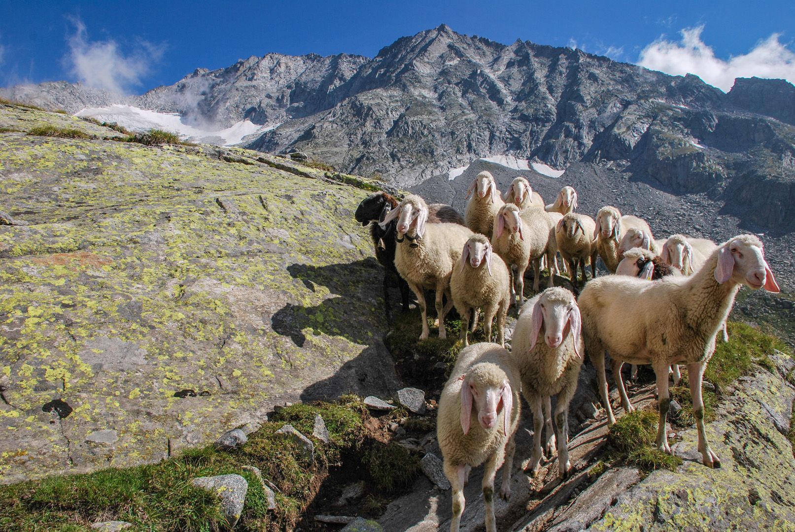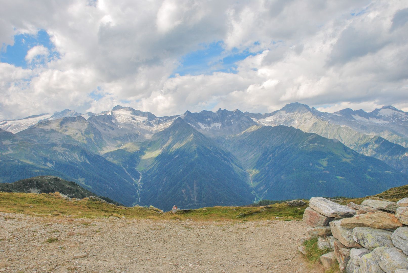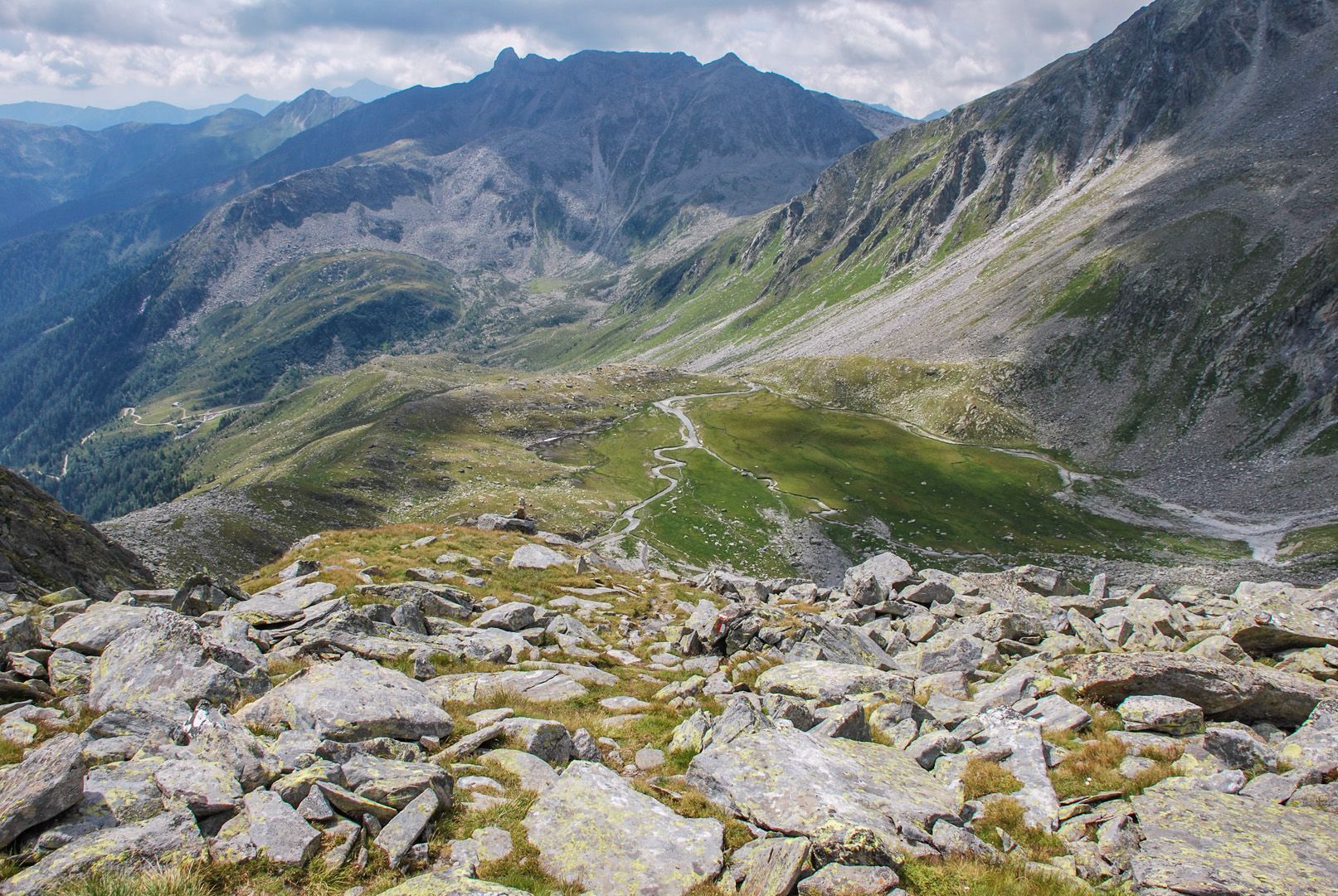 Vom Parkplatz am Mitterbach überschreiten wir die Brücke und gehen in wenigen Kehren, vorbei an der Riesa Alm 1442m taleinwärts auf der Forststraße zur Mitterbach Alm, die sich am Ende des Waldes an der orographischen linken Talseite befindet. Entlang der Almwiesen steigen wir über mäßig steilere Höhenstufen im steinigen Gelände und gelangen zu den Oberhütten 1883m. Im Schutze der riesigen Felsblöcke schmiegen sich die verlassenen Hütten in den Hang. Sie sind stumme Zeugen längst vergangener Almbewirtschaftung. Hier scheint die Zeit stillzustehen, wenn nicht ab und zu Felsen donnernd talwärts stürzen. Stets im Blickfeld haben wir die formschönen Hornspitzen vor uns während wir weiter zum oberen Talboden wandern. Für trittsichere Wanderer lohnt sich der Aufstieg zum Stabeler Höhenweg 24a. Über die steile, lockere Gesteinsschutthalde kann man die Gelenkscharte 2724m erreichen und zur Göge absteigen. Zwischen Felsblöcken, Mauerresten ehemaliger Stallungen vorbei biegt der Steig links ab. Serpentinenartig gewinnt man schnell an Höhe, überquert das Rinnsal, die gesicherten Stellen und gelangt über den kargen Geländerücken “In der Haspel” auf den Höhenweg 2450m. Steil und rippenartig schneidet sich rückblickend das Tal in die großartige Landschaft, wo einst ein fürchterlicher Drachen gewütet haben soll.
